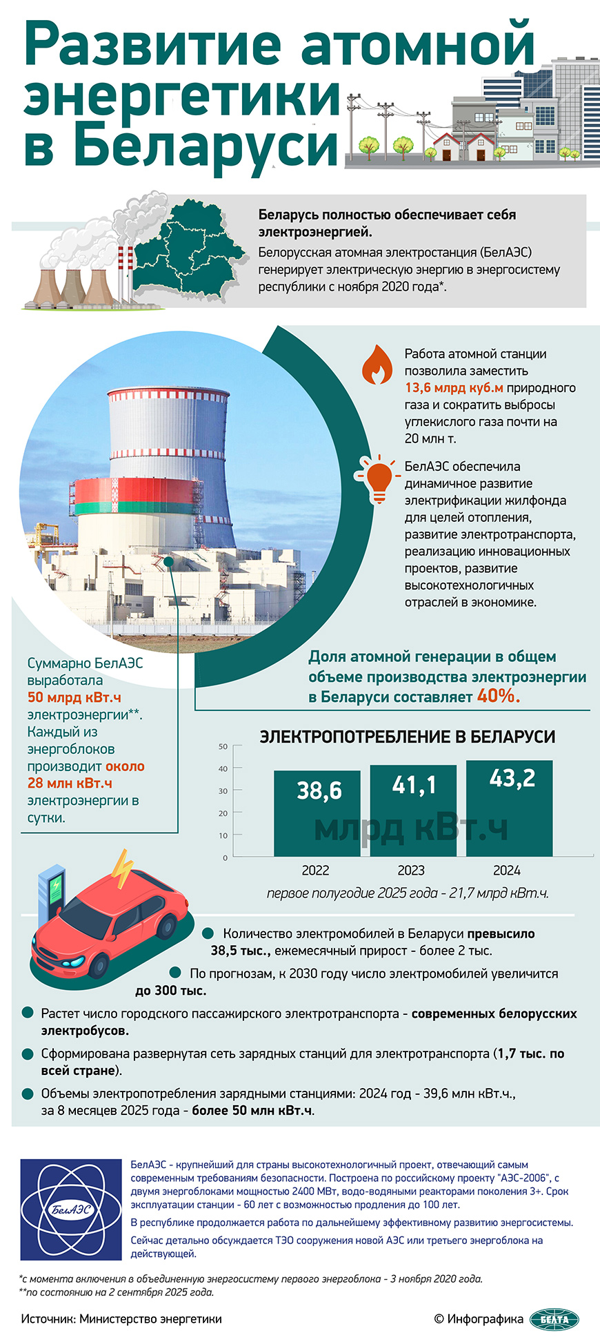 Белорусская АЭС с двумя реакторами ВВЭР-1200 суммарной мощностью 2400 МВт построена по российскому проекту «АЭС-2006», который относится к эволюционным проектам АЭС с водо-водяными реакторами (ВВЭР) третьего поколения повышенной безопасности. Они имеют улучшенные технико-экономические показатели. Главная их особенность — уникальное сочетание активных и пассивных систем безопасности.